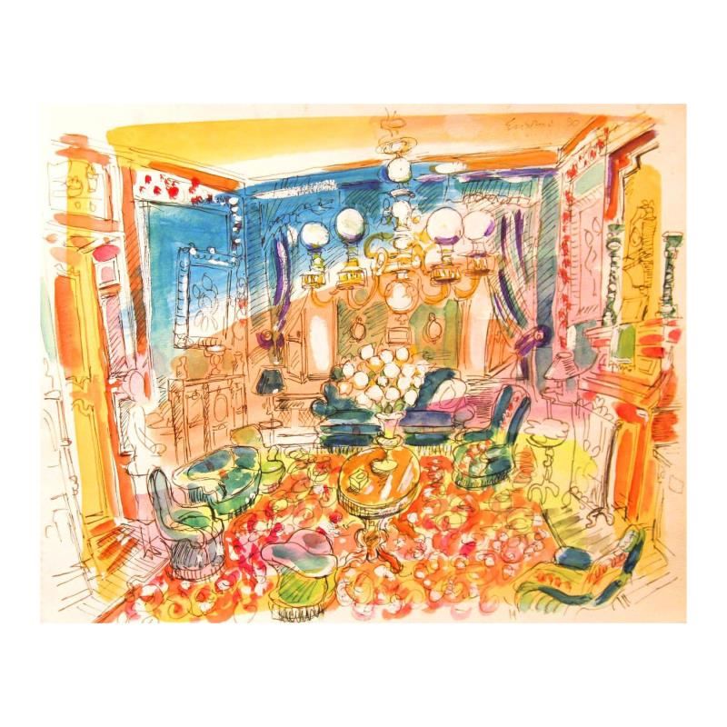 "Salon Verte of Chateau Lafite-Rothschild" is an original Mixed Media on Paper by Wayne Ensrud. The piece is hand signed by the artist and comes with a Certificate of Authenticity. Measures approximately 14" x 18".
