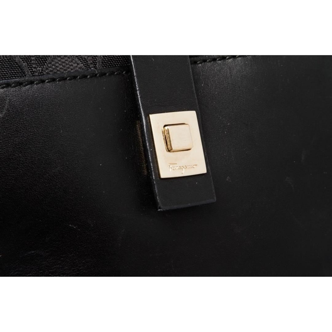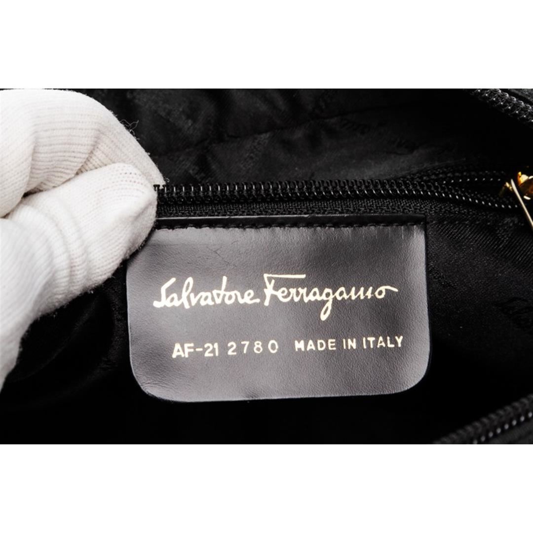 One Salvatore Ferragamo Black Canvas Shoulder Handbag. Crafted out of black canvas and leather trim. Zip top closure, outer turn lock closeip pocket, and gold tone hardware. Inner black fabric lining and zip side pocket.