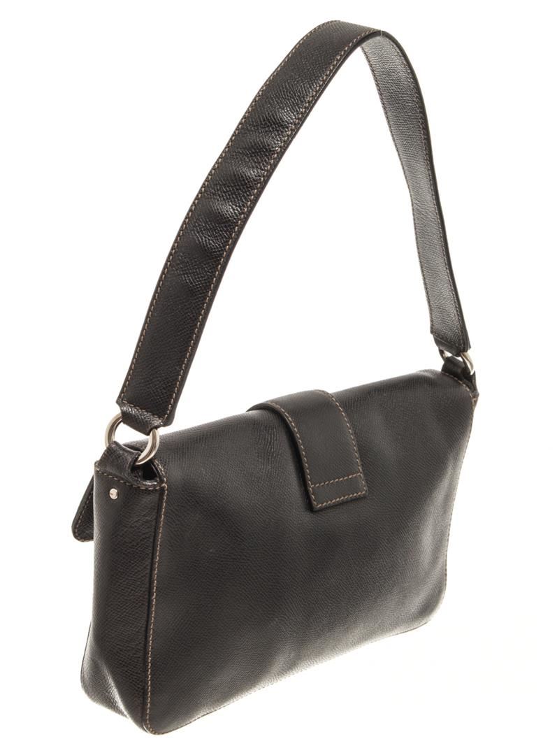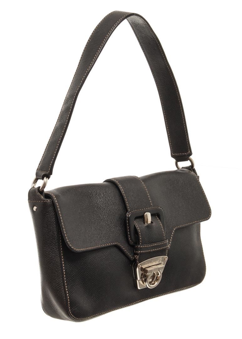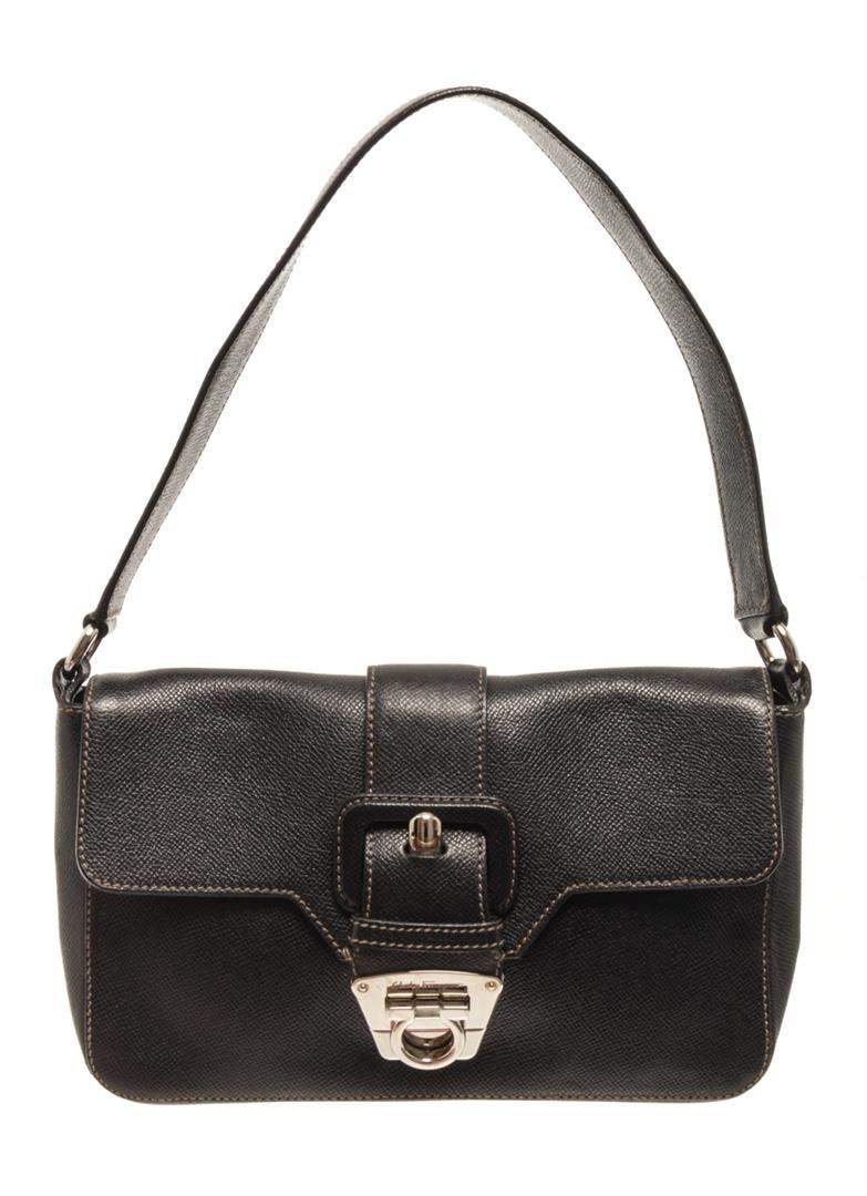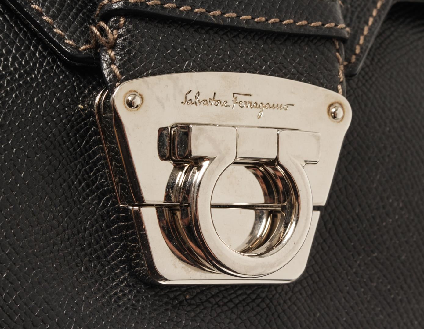 One Salvatore Ferragamo Black Leather Ganc Shoulder Bag. Item is sold AS-IS. All available information is listed in the description and shown in the photo. Salvatore Ferragamo Black Leather Ganc Shoulder Bag with shoulder strap, interior pocket, brown lining, silver tone hardware, and turn lock closure.