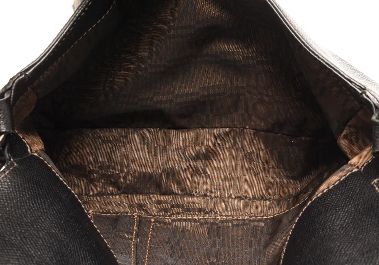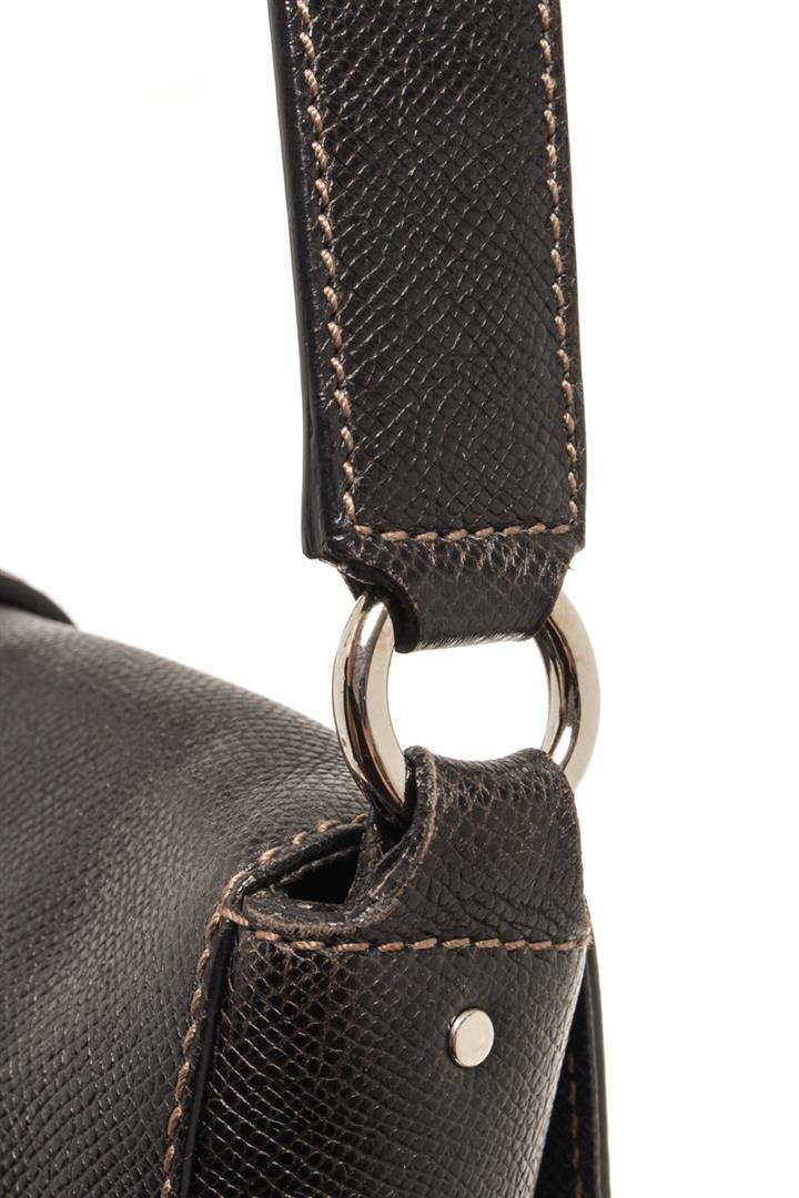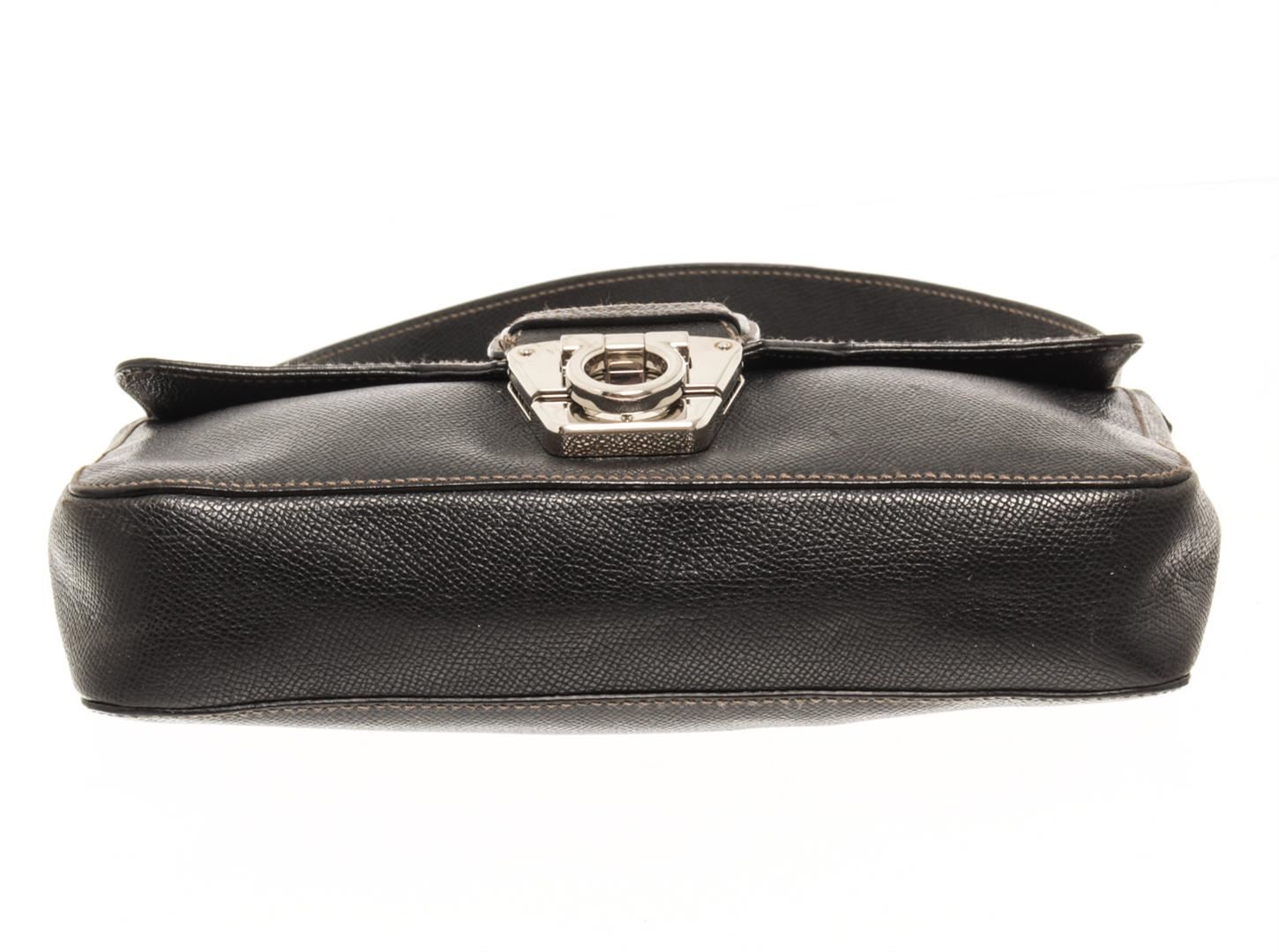 One Salvatore Ferragamo Black Leather Ganc Shoulder Bag. Item is sold AS-IS. All available information is listed in the description and shown in the photo. Salvatore Ferragamo Black Leather Ganc Shoulder Bag with shoulder strap, interior pocket, brown lining, silver tone hardware, and turn lock closure.