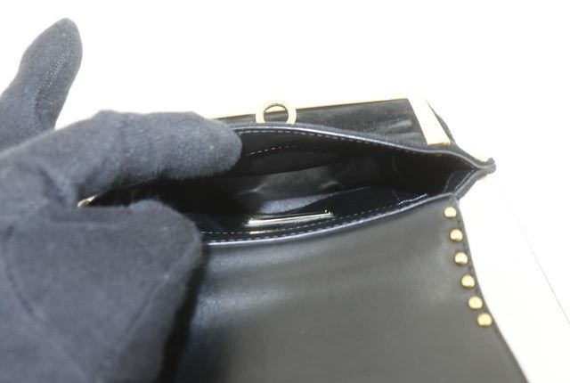 Black suede leather and gold-tone accents Salvatore Ferragamo Gancini 2way shoulder bag with gold-tone hardware, a detachable shoulder strap, black leather flat top handle, front flap that will open to black leather-lined interior multiple pockets inside.