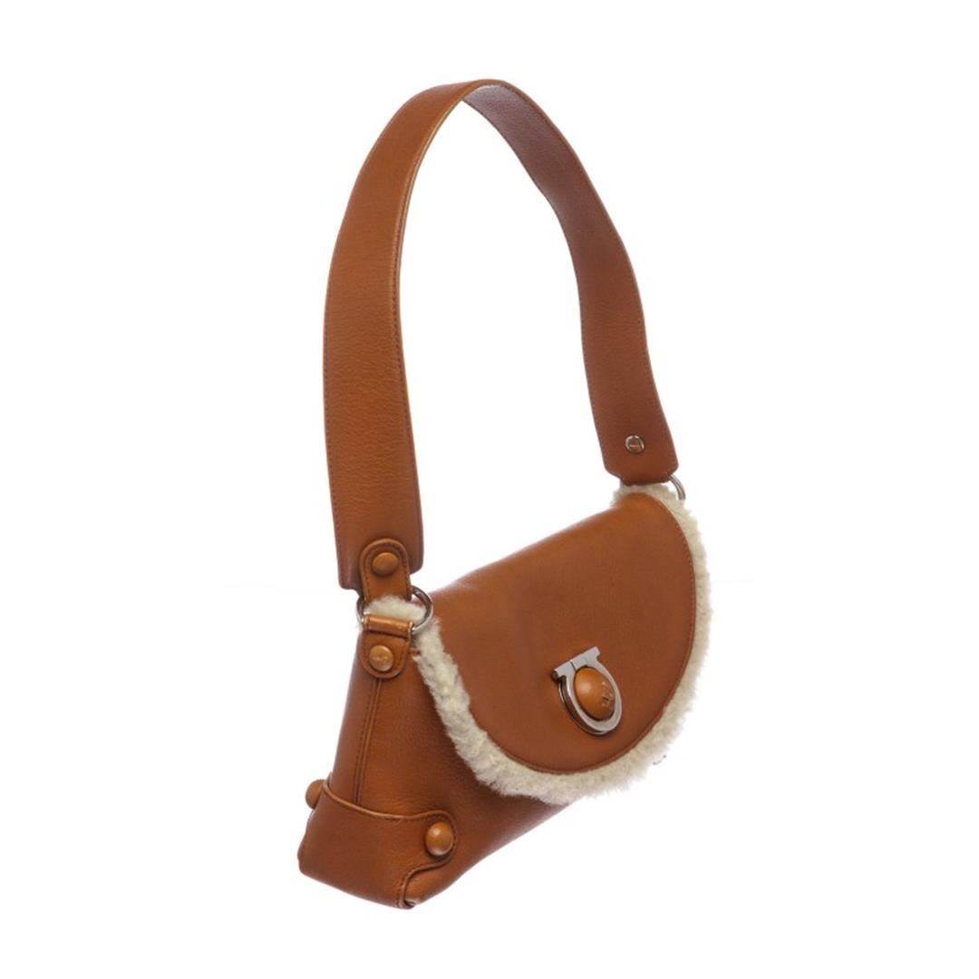 One Salvatore Ferragamo Brown Leather Small Shoulder Handbag. Crafted out of brown leather and beige shearling trim, silver tone hardware, single flat strap, magnetic snap closure. Inner brown fabric lining and side zip pocket.