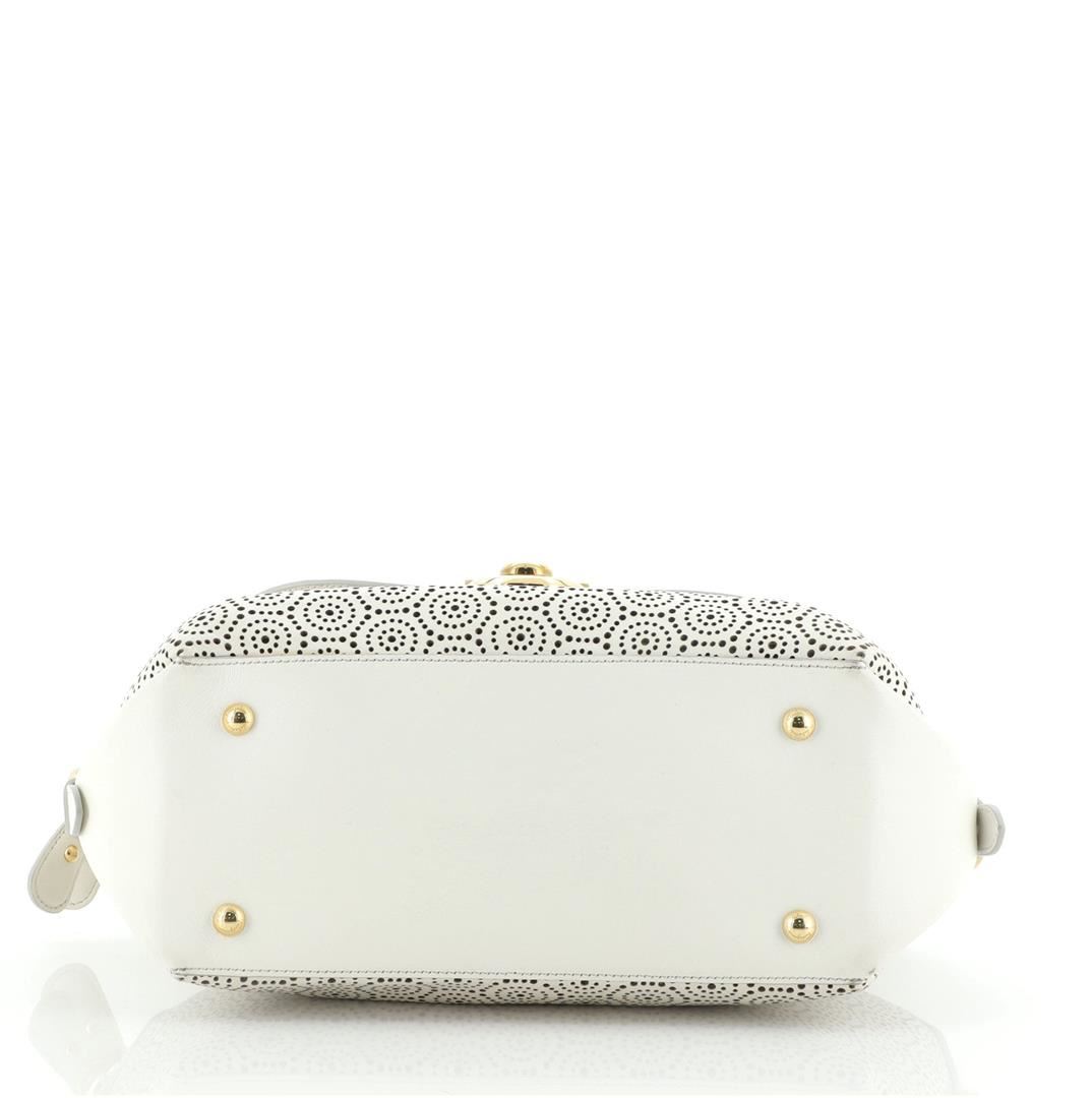 One Salvatore Ferragamo Fiamma Satchel Laser Cut Leather Medium White. Item is sold AS-IS. All available information is listed in the description and shown in the photo. Salvatore Ferragamo Fiamma Satchel Laser Cut Leather Medium White Condition Details: Moderate wear and darkening on base corners, slight darkening and scuffs on leather trims and handles. Glue stains on zipper trim, scratches on hardware. Height 9", Width 12", Depth 5", Strap Drop 18-20
