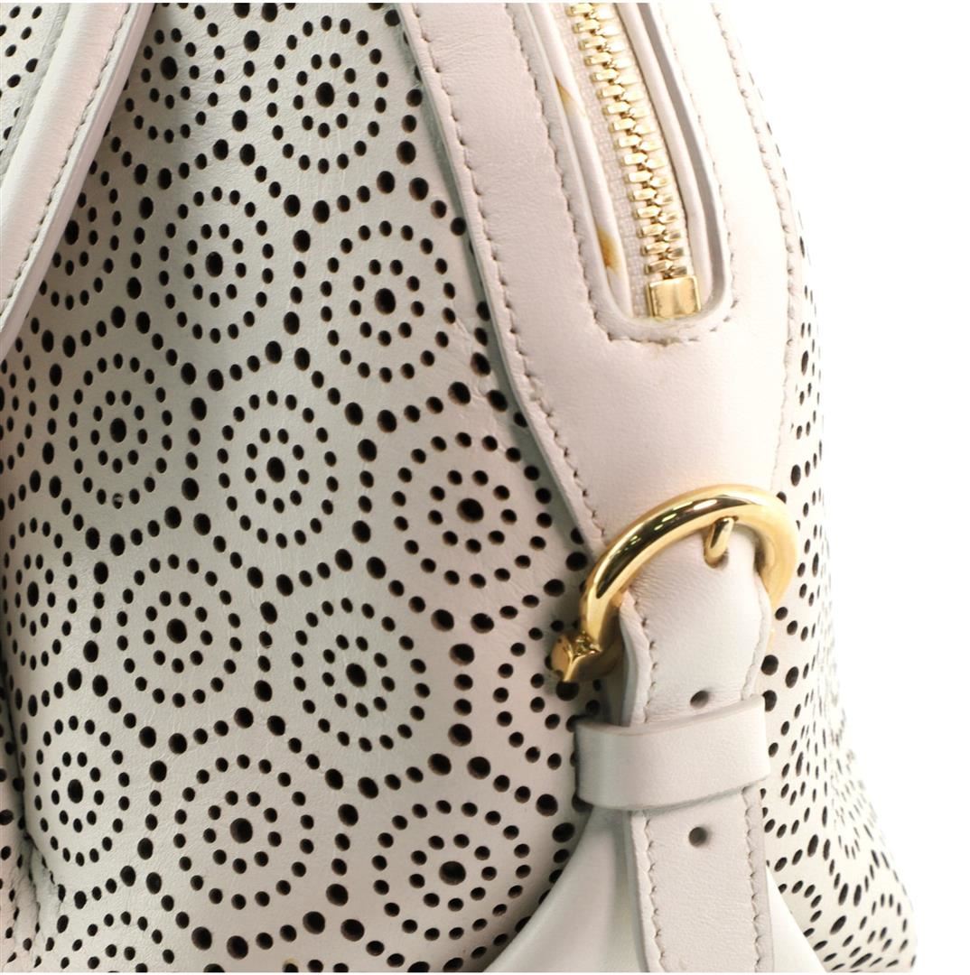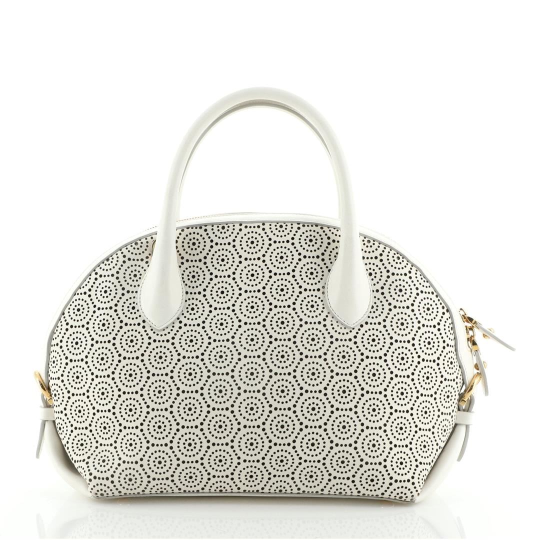 One Salvatore Ferragamo Fiamma Satchel Laser Cut Leather Medium White. Item is sold AS-IS. All available information is listed in the description and shown in the photo. Salvatore Ferragamo Fiamma Satchel Laser Cut Leather Medium White Condition Details: Moderate wear and darkening on base corners, slight darkening and scuffs on leather trims and handles. Glue stains on zipper trim, scratches on hardware. Height 9", Width 12", Depth 5", Strap Drop 18-20