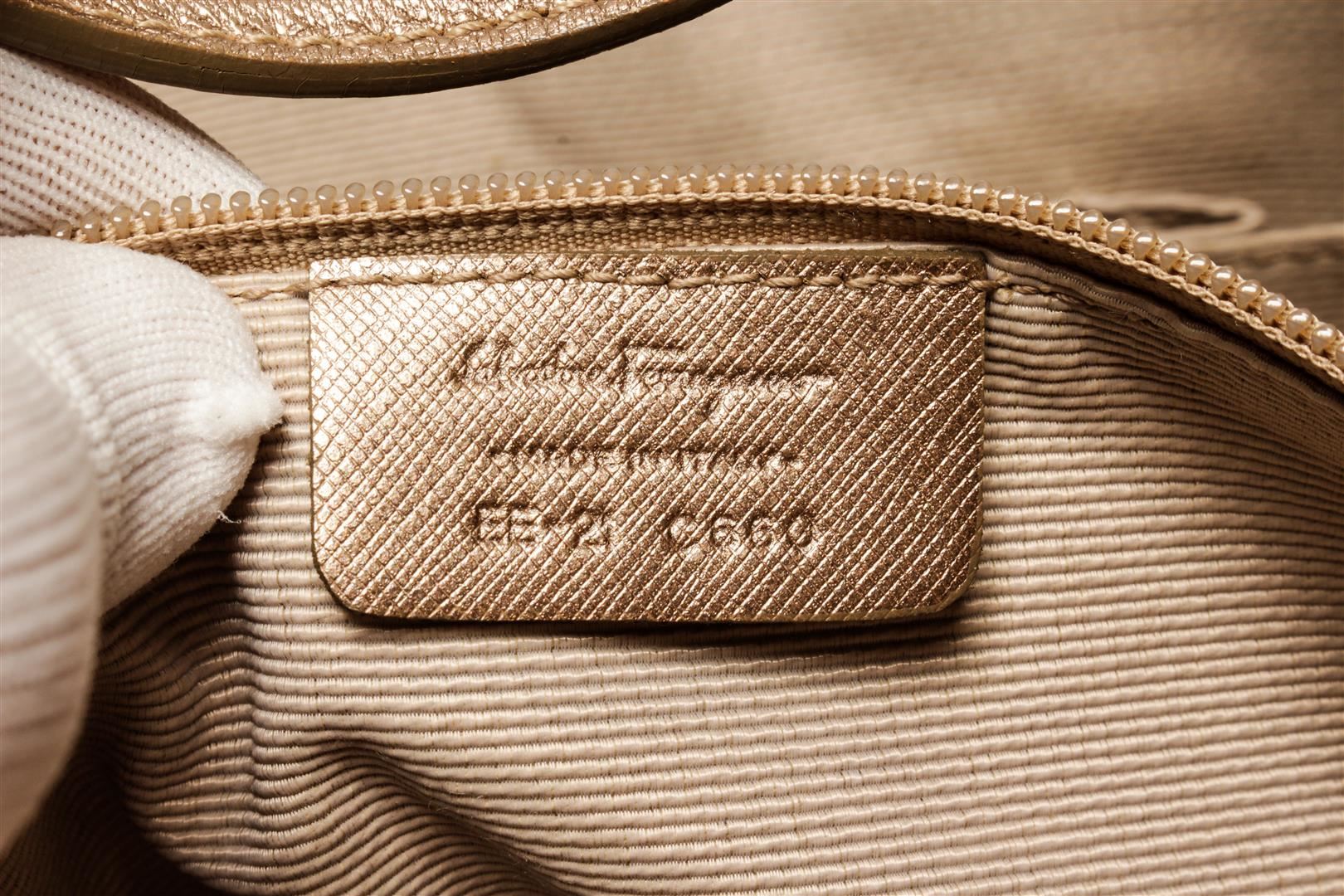 Salvatore Ferragamo Light Bronze Leather Perforated Hobo Bag. All available information is listed in the description and shown in the photos. Salvatore Ferragamo Light Bronze Leather Perforated Hobo Bag with Gold-tone Hardware, Bronze Leather Trim, Light Beige Lining, Zip and Slip Interior Pockets, Leather Shoulder Strap, and Zipper Closure at the top.