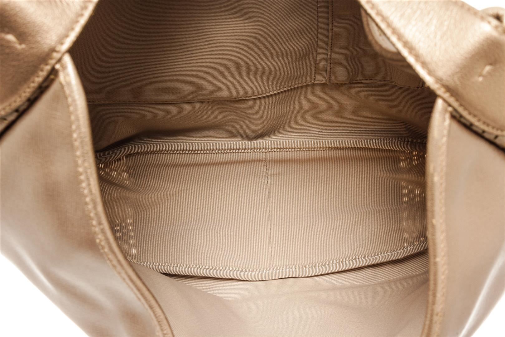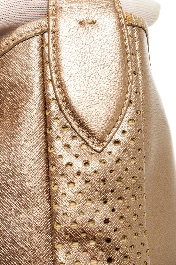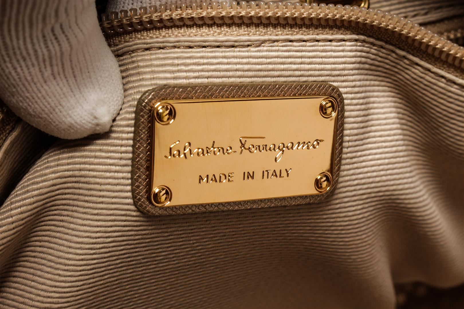 Salvatore Ferragamo Light Bronze Leather Perforated Hobo Bag. All available information is listed in the description and shown in the photos. Salvatore Ferragamo Light Bronze Leather Perforated Hobo Bag with Gold-tone Hardware, Bronze Leather Trim, Light Beige Lining, Zip and Slip Interior Pockets, Leather Shoulder Strap, and Zipper Closure at the top.