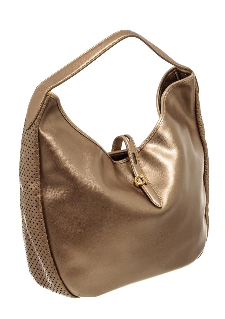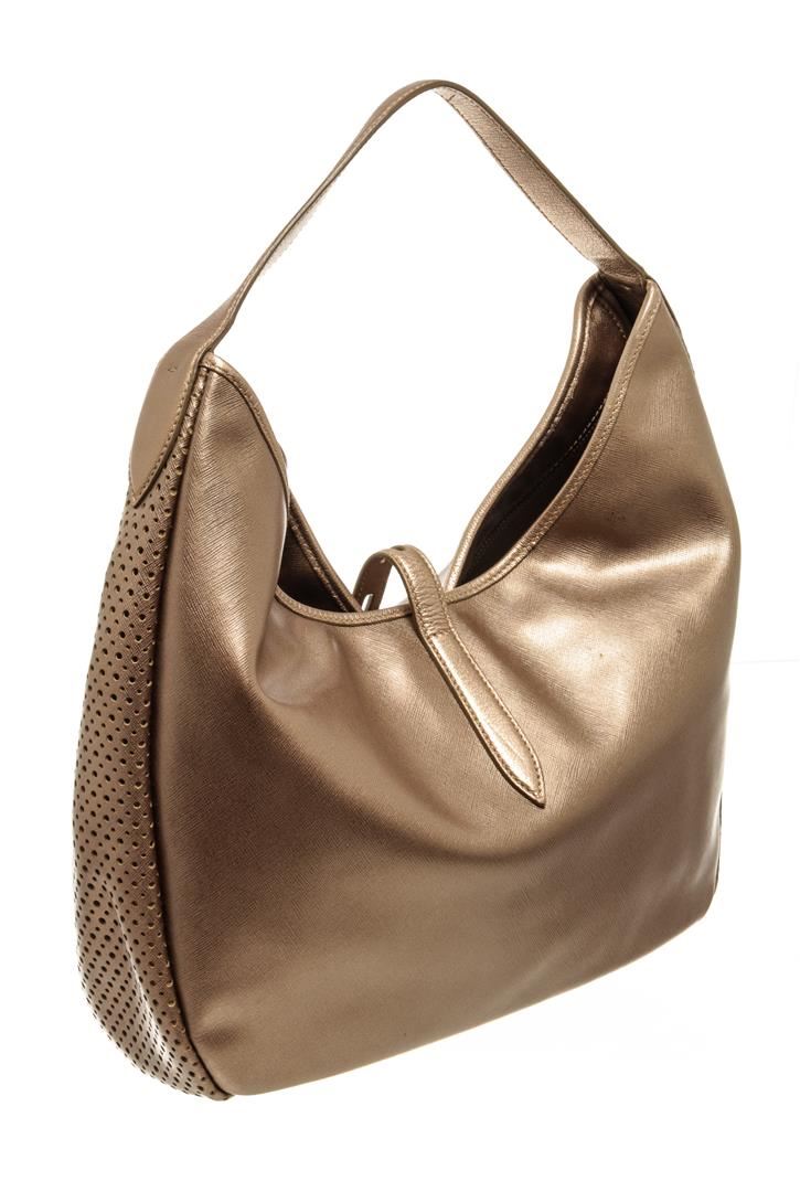 Salvatore Ferragamo Light Bronze Leather Perforated Hobo Bag. All available information is listed in the description and shown in the photos. Salvatore Ferragamo Light Bronze Leather Perforated Hobo Bag with Gold-tone Hardware, Bronze Leather Trim, Light Beige Lining, Zip and Slip Interior Pockets, Leather Shoulder Strap, and Zipper Closure at the top.