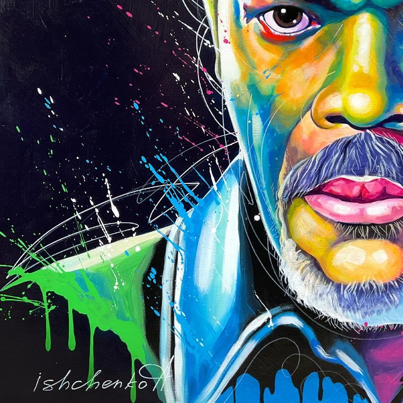 "Samuel Jackson" is an original acrylic painting on canvas by Alexander Ishchenko, hand signed by the artist. Includes Letter of Authenticity. Measures approx. 36" x 36" (image).