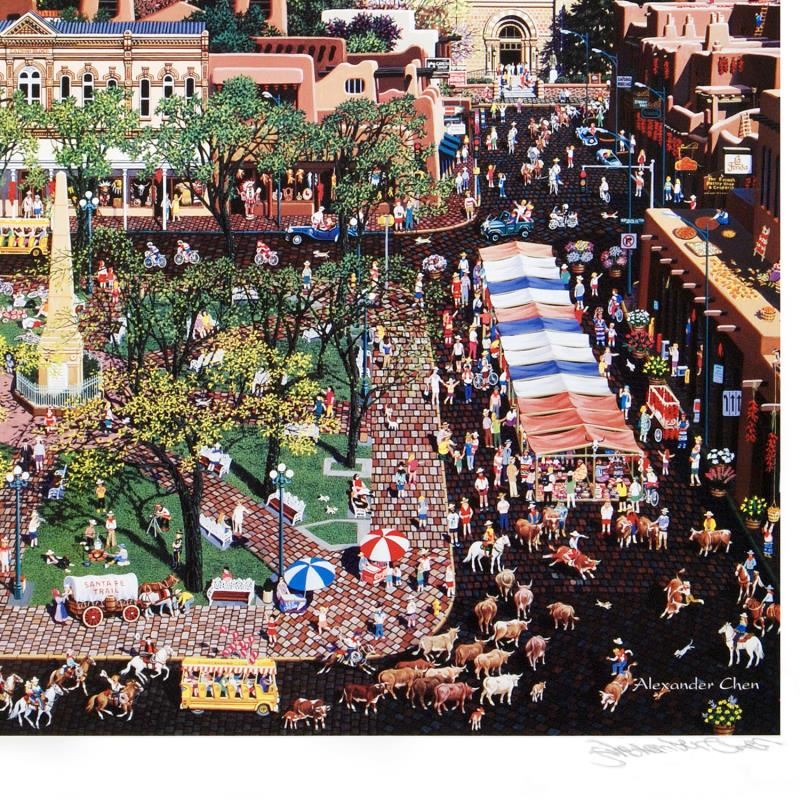 Alexander Chen creates stunningly detailed masterpieces filled with elaborate icons and a touch of fantasy. "Santa Fe" is a limited edition offset lithograph on paper by Alexander Chen, numbered and hand signed by the artist. Includes Certificate of Authenticity! Measures approx. 23.5" x 17.5" (with border), 21" x 15" (image).