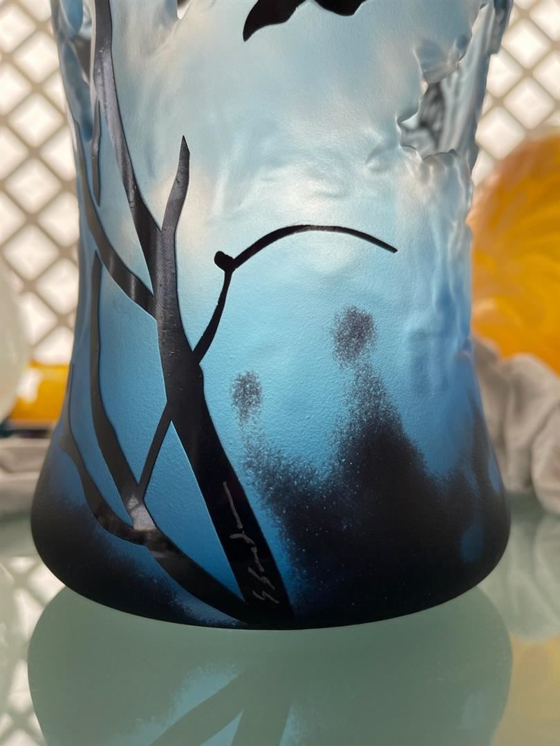 Hand-blown blue Floral Vase, hand-sculpted & etch signed by Gustavo Santana/Santana Art Glass 11.5 inches tall x 7.5 inches wide.