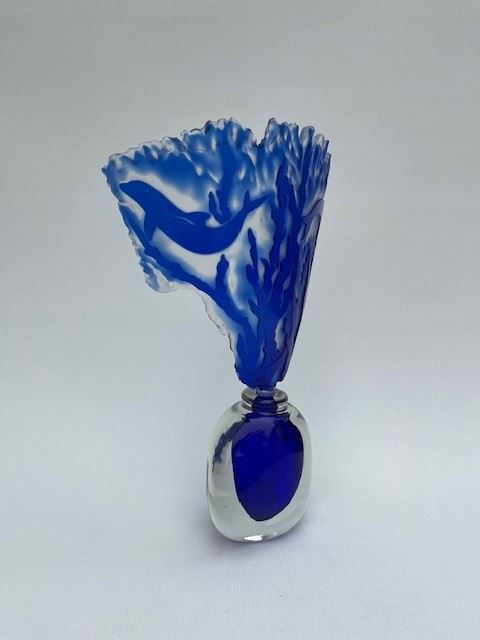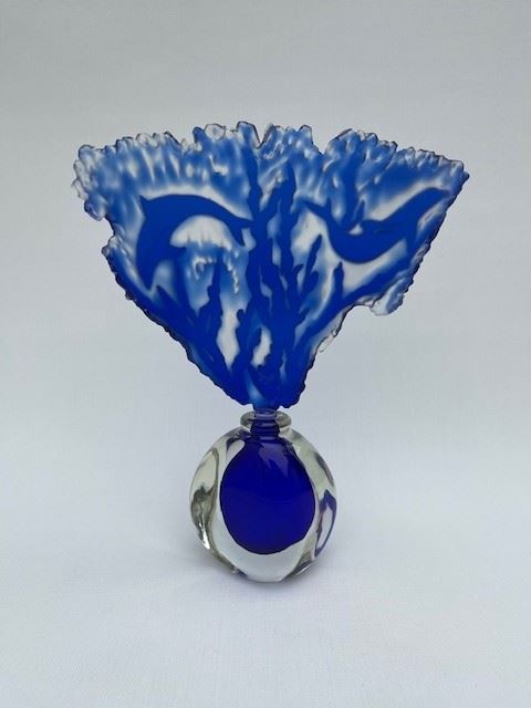 Hand-blown cobalt perfume bottle with carved stopper. 12.25 inches tall x 9 inches wide. Etch signed by Gustavo Santana/Santana Art Glass.