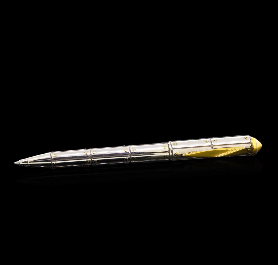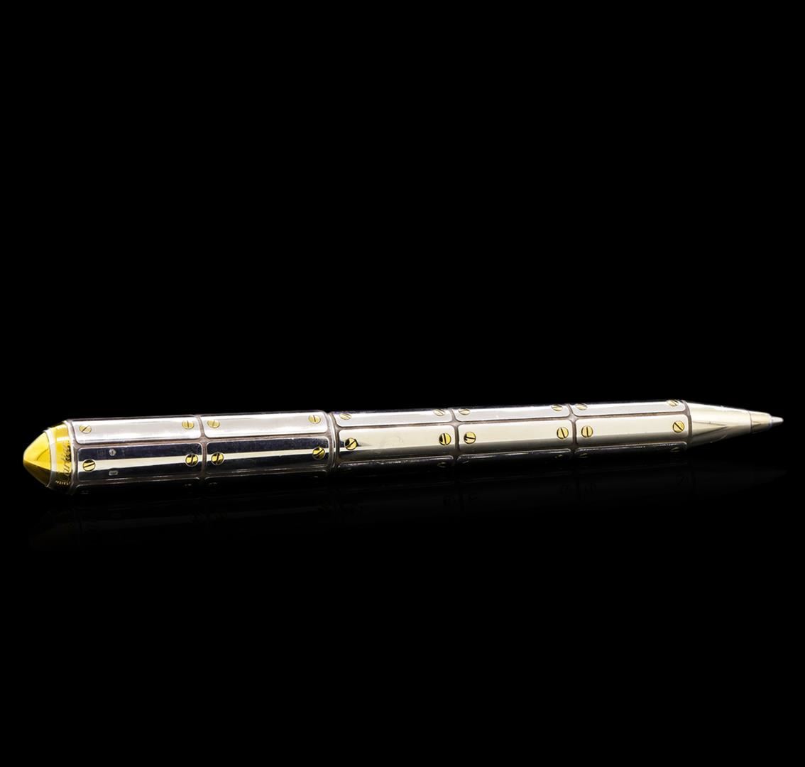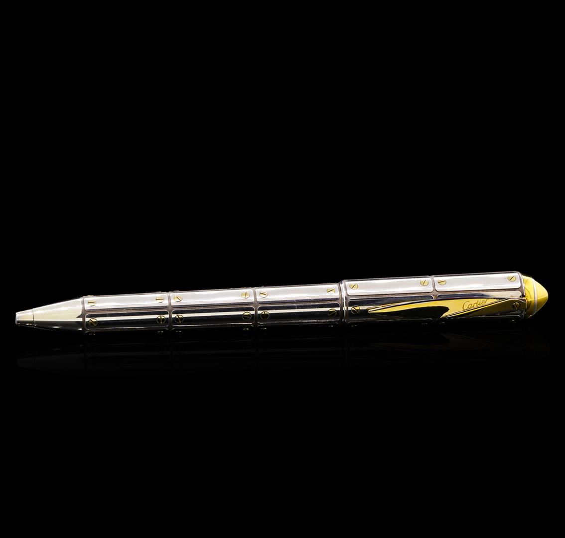 One Santos de Cartier Limited Edition Ballpoint Pen featuring a sterling silver body and cap, 9KT yellow gold screws, and gold plated clip. Limited Edition of only 1,904 pens worldwide. Other than minor surface scratches, the pen is in good, working condition.