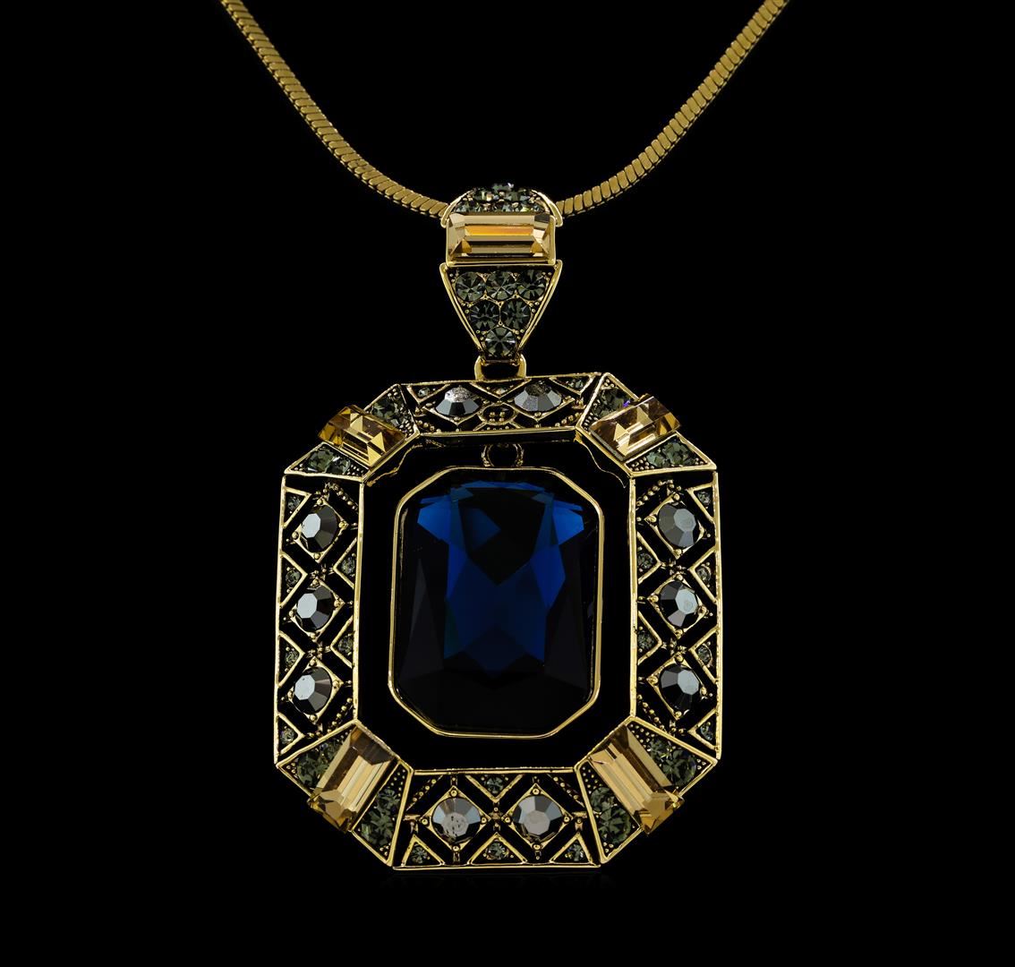 High end designer jewelry. Sapphire Crystal Necklace - Gold Plated. Gold Plated Chain. Blue/ Gold. 24/2.25inche.