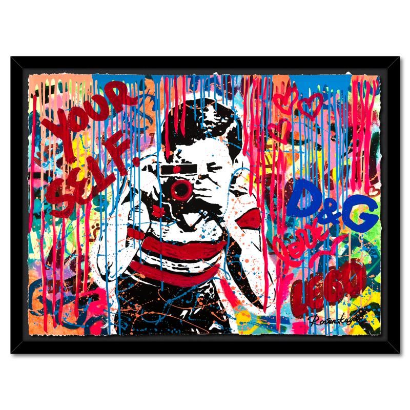 "Say Cheese" is a one-of-a-kind mixed media on deckle edge paper by Nastya Rovenskaya; hand signed by the artist. This piece comes custom framed and includes letter of authenticity. Measures approximately 36" x 46" (framed), 30" x 40" (image).