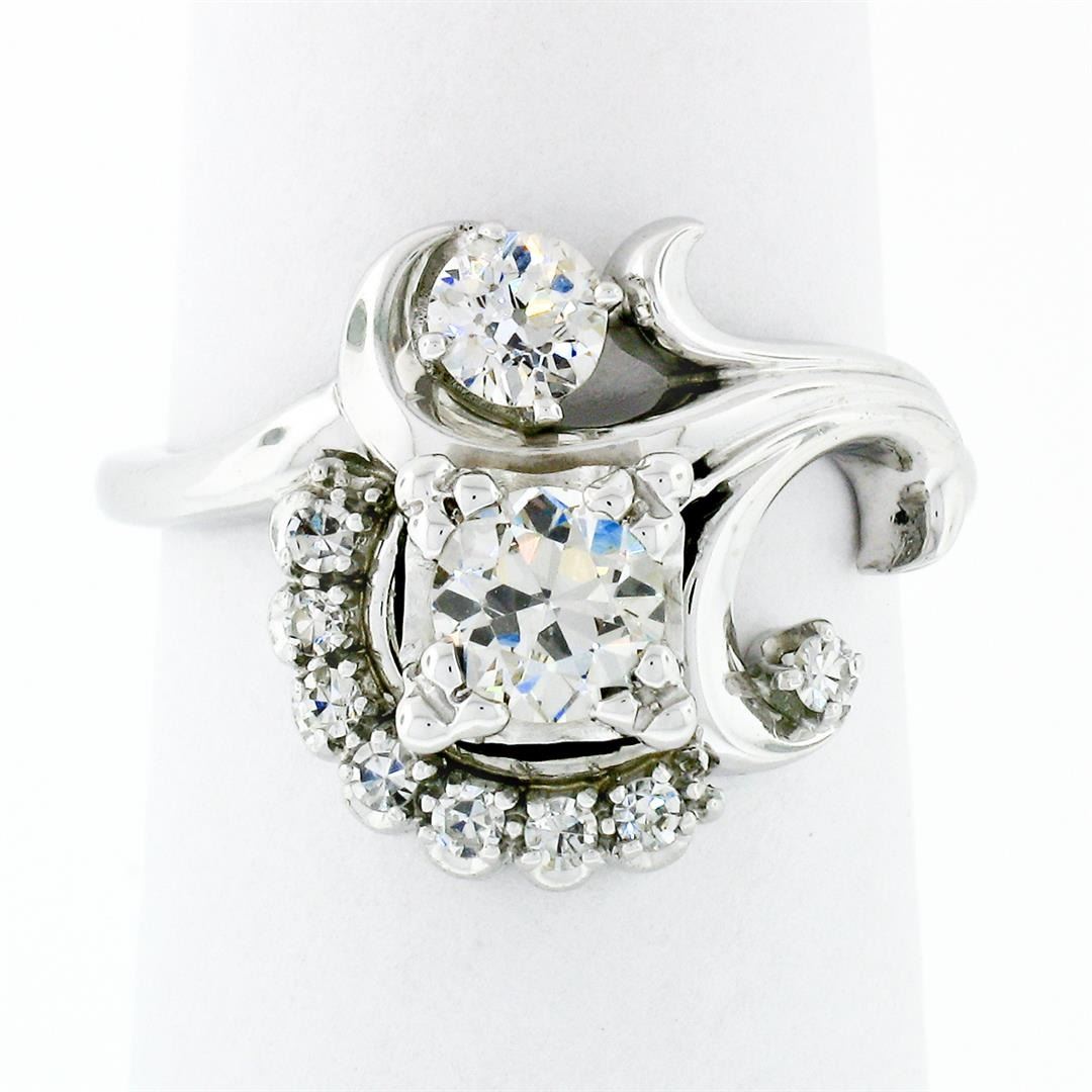 An antique solid 18k white gold cocktail ring by Schneider's, with 2 old european cut natural diamonds (I - VS2 ; 0.73ctw), and 8 old single cut natural diamonds (H/I - VS1/VS2 ; 0.15ctw). The ring is size 6, weighs a total of 6.0 grams, and measures 14.75mm wide.