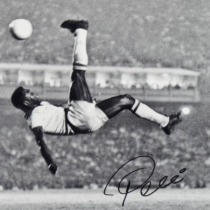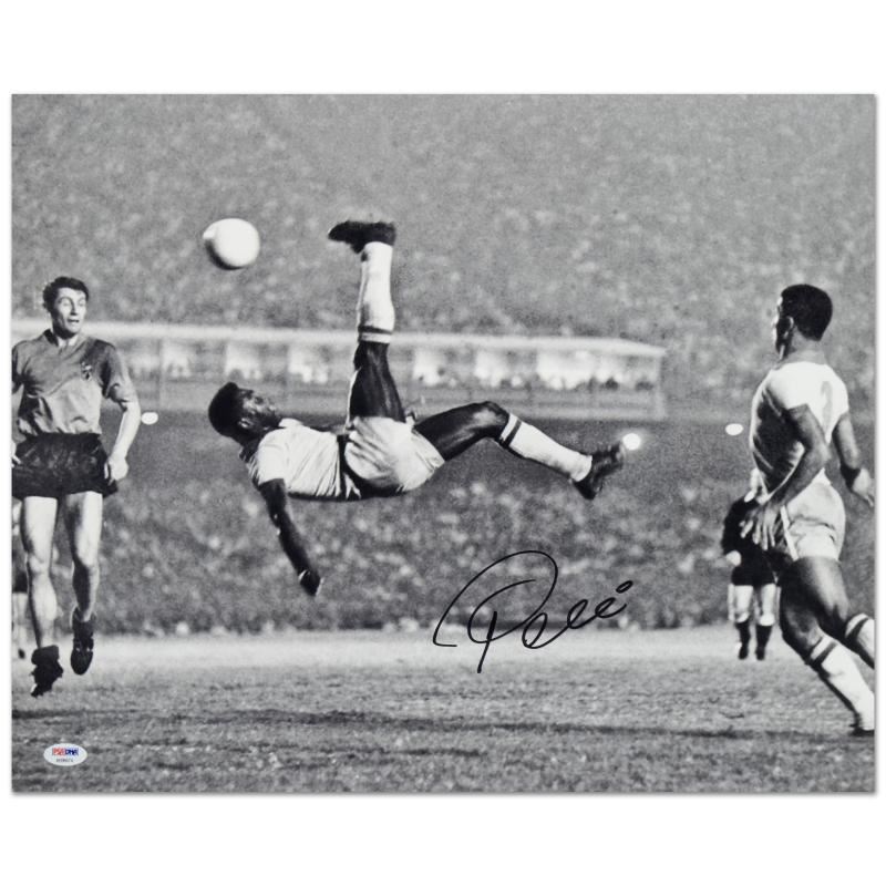 "Scissor Kick" is a print on paper that is autographed by legendary Brazilian footballer, Pele! This piece is presented with a Certificate of Authenticity from PSA/DNA, which authenticates sports memorabilia using proprietary permanent invisible ink as well as a strand of synthetic DNA. We make no additional warranties. Measures approx. 20" x 16" (image).