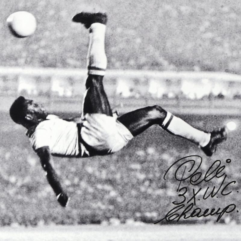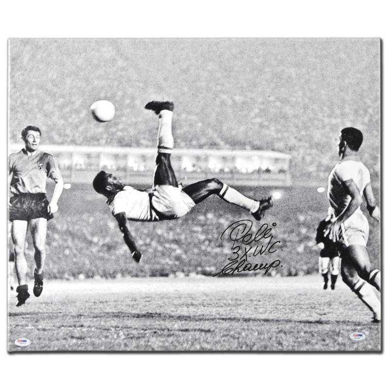 "Scissor Kick" is a gallery wrapped print on canvas that is autographed by legendary Brazilian footballer, Pele! This piece was authenticated by PSA/DNA, which authenticates sports memorabilia using proprietary permanent invisible ink as well as a strand of synthetic DNA. Comes with PSA/DNA sticker bearing the registration number (# Z80916). We make no additional warranties. Measures approx. 20" x 25" (image).