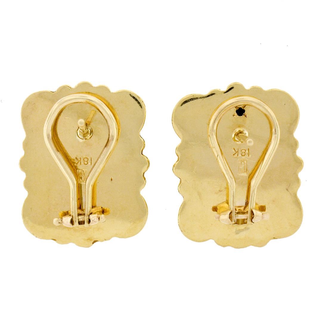 A pair of detailed 18k yellow gold earrings by Scott Gauthier featuring a pair of rectangular cut agates (10.45x6.90mm). The earrings measure approximately 22.50x17.65mm and weigh a total of 13.2 grams.
