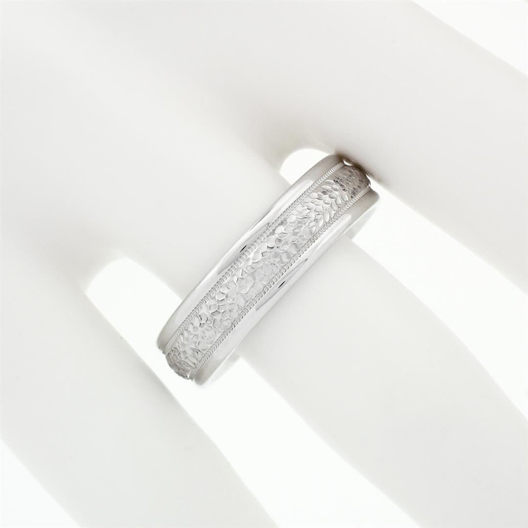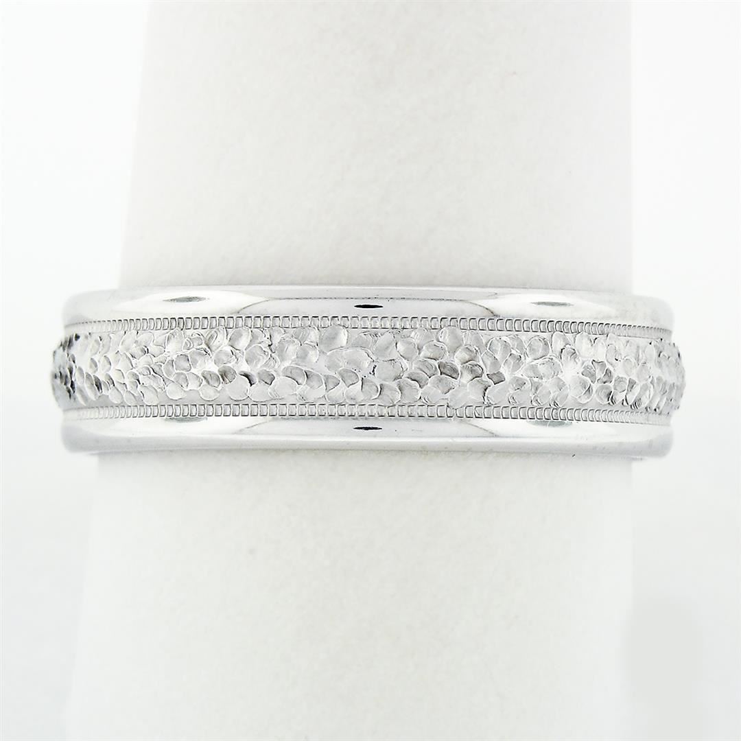 A solid platinum band ring by scott kay. The ring is size 10, weighs a total of 12.44 grams, and measures 5.95 mm wide.