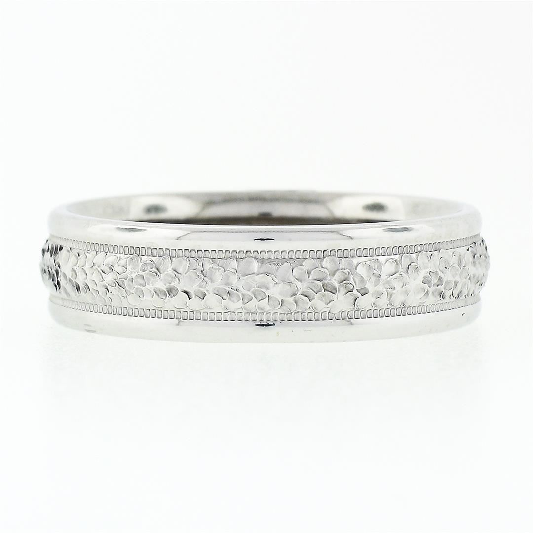 A solid platinum band ring by scott kay. The ring is size 10, weighs a total of 12.44 grams, and measures 5.95 mm wide.