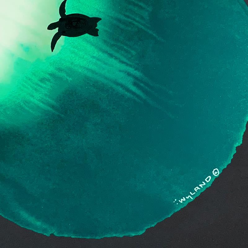 "Sea Turtle" is an original painting, watercolor on deckle edge paper by Wyland. Hand signed by the artist, the piece comes custom framed and with a letter of authenticity. Measures approximately 30" x 30" (framed), 19.5" x 19.5" (image).