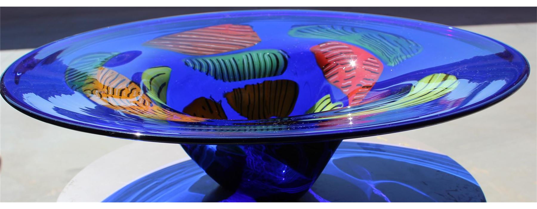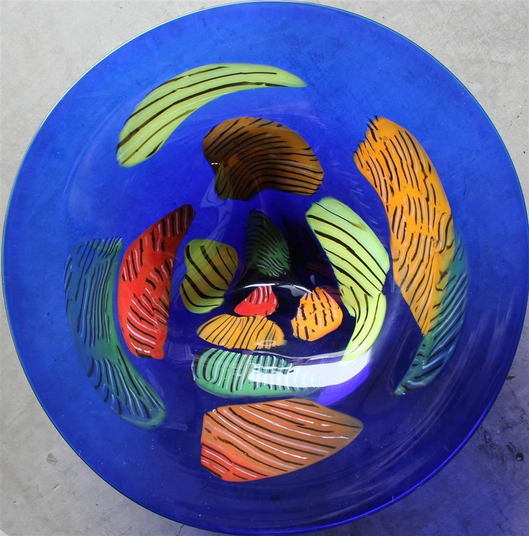 Glass sculptor, Dutch Schulze, produced a round, seafoam blue, glass bowl with varied-colored abstract designs. The bowl #5111 measures 7.5 x 21.25.