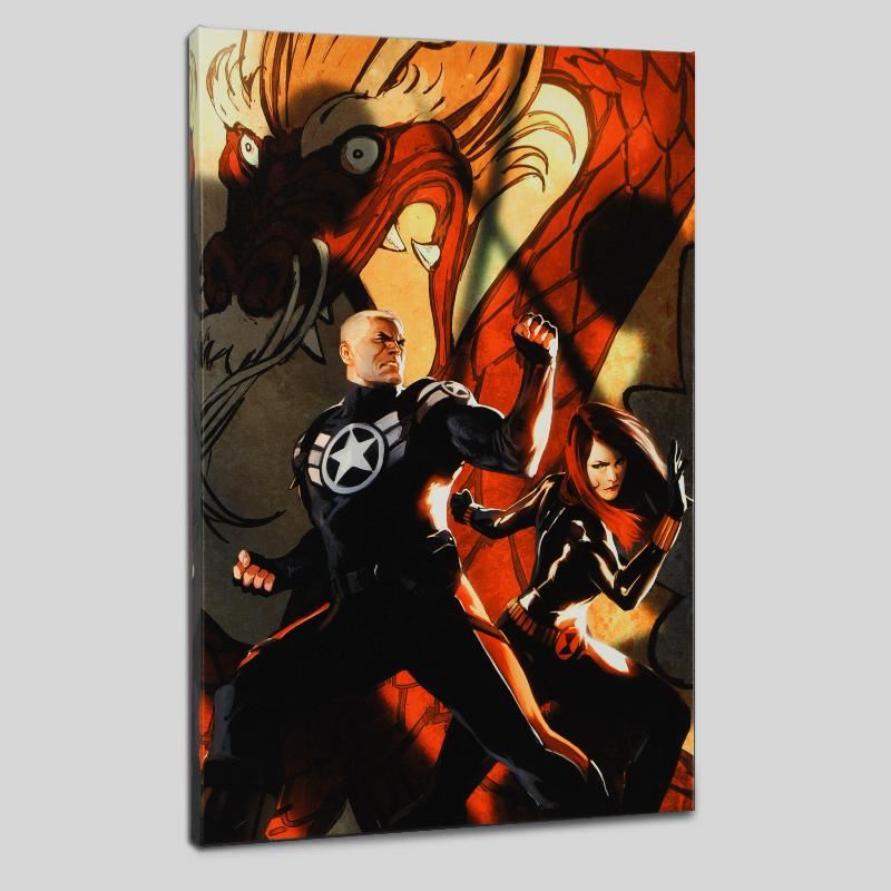 A piece of comic book history, this limited edition, from original art by Marko Djurdjevic, depicts Steve Rogers and Black Widow. Marko Djurdjevic was discovered by Marvel after posting a series of re-designs for popular X-Men characters. Marvel then offered Djurdjevic the opportunity to draw covers for some of their popular series, like Spider-Man, Daredevil, and Thor. "Secret Avengers #6" is a limited edition numbered giclee on canvas by Marko Djurdjevic presented by Marvel Comics. This piece ocmes gallery wrapped and ready to hang. Includes Certificate of Authenticity! Measure approx. 18" x 27" (image).