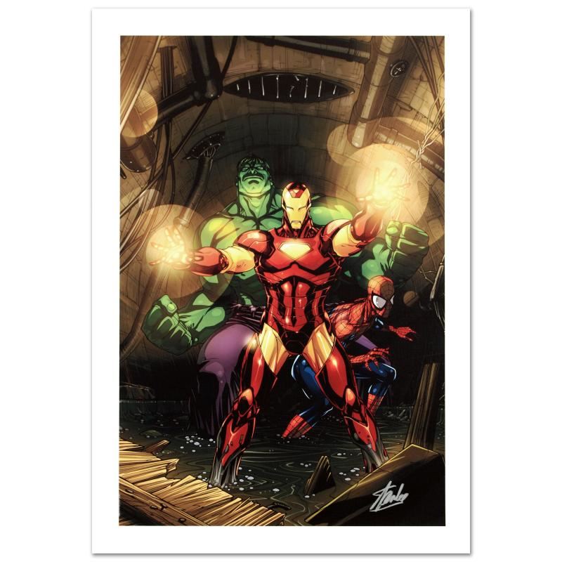 A piece of comic book history, this limited edition, from original art by Leinil Francis Yu, depicts the classic characters The Hulk, Spider-Man, and Iron Man. After winning the Wizard's Drawing Board Contest, Marvel Comics hired Leinil Francis Yu to work on the Wolverine series. After his run on Wolverine, he moved on to work on Marvel's core X-Men title in 2000. Yu continued to work on other Marvel titles such as Fantastic Four, Ultimate Wolverine vs. Hulk and New Avengers. "Secret Invasion #7" is a limited edition numbered giclee on canvas by Leinil Francis Yu presented by Marvel Comics, hand signed by the great Stan Lee! Includes Certificate of Authenticity! Measures approx. 18" x 27" (image).