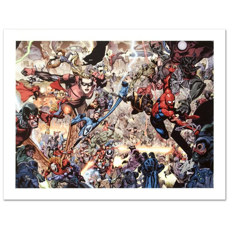 A piece of comic book history, this limited edition, from original art by Leinil Francis Yu, depicts classic characters such as Spider-Man, Ronin, Stature, Mr. Fantastic, and many others. After winning the Wizard's Drawing Board Contest, Marvel Comics hired Leinil Francis Yu to work on the Wolverine series. After his run on Wolverine, he moved on to work on Marvel's core X-Men title in 2000. Yu continued to work on other Marvel titles such as Fantastic Four, Ultimate Wolverine vs. Hulk and New Avengers. "Secret Invasion #7" is a limited edition giclee on canvas by Leinil Francis Yu presented by Marvel Comics, numbered and hand signed by the great Stan Lee! Includes Certificate of Authenticity! Measure approx. 24" x 18" (image).