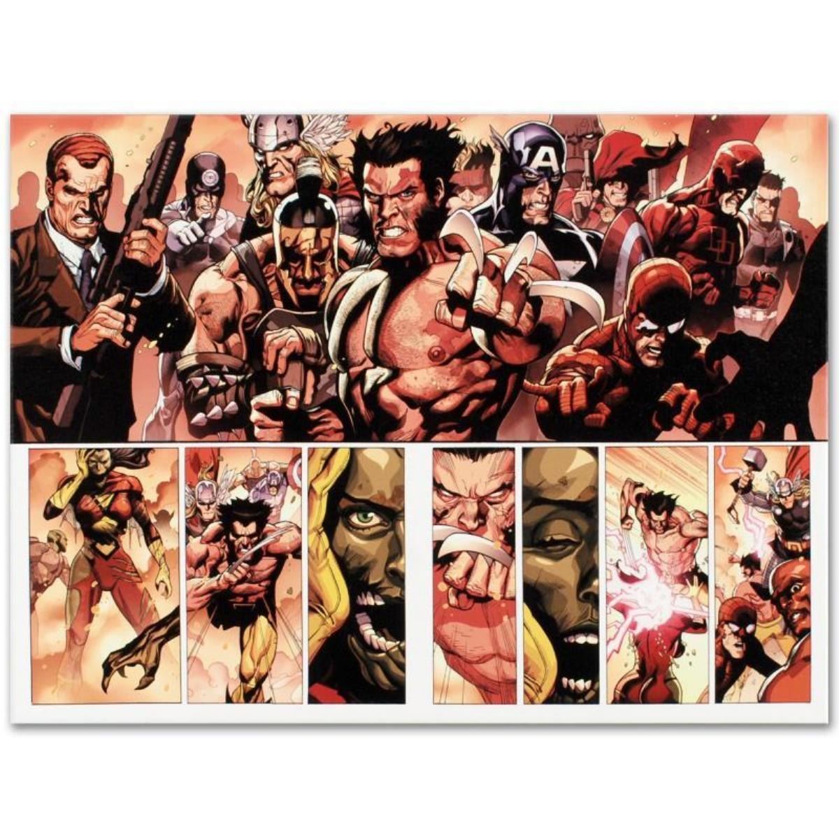 Secret Invasion #8 by Marvel Comics. A piece of comic book history, this limited edition, from original art by Leinil Francis Yu, depicts Wolverine, Spider-Man, DareDevil, Captain America, Ares, and Norman Osborn. After winning the Wizard's Drawing Board Contest, Marvel Comics hired Leinil Francis Yu to work on the Wolverine series. After his run on Wolverine, he moved on to work on Marvel's core X-Men title in 2000. Yu continued to work on other Marvel titles such as Fantastic Four, Ultimate Wolverine vs. Hulk and New Avengers. "Secret Invasion #8" is a limited edition giclee on canvas by Leinil Francis Yu presented by Marvel Comics! This piece comes gallery wrapped. Includes Certificate of Authenticity! Measures approx. 24" x 18" (image). This item requires special handling and may have a longer than usual turnaround.