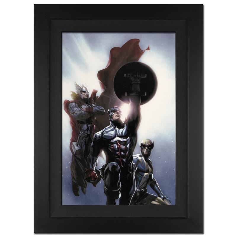 A piece of comic book history, this limited edition, from original art by Gabriele Dell'Otto, depicts the heroic trio of Thor, Captain America, and Wolverine. In 1998 Dell'Otto started collaborating with the European division of Marvel Comics, producing covers, posters and lithographies for Italy, France and Germany. In 2002, his work was shown to the editor-in-chief of Marvel Comics, who entrusted to him with the art for the Secret War mini-series. "Secret Invasion #8" is an extremely limited edition giclee on canvas by Gabriele Dell'Otto presented by Marvel Comics, hand signed by the great Stan Lee and numbered out of only 10! This piece comes custom framed and ready to hang. Includes Certificate of Authenticity! Measures approx. 25" x 34" (with frame), 18" x 27" (image). Please allow 5 additional business for items that include canvas stretch or framing.