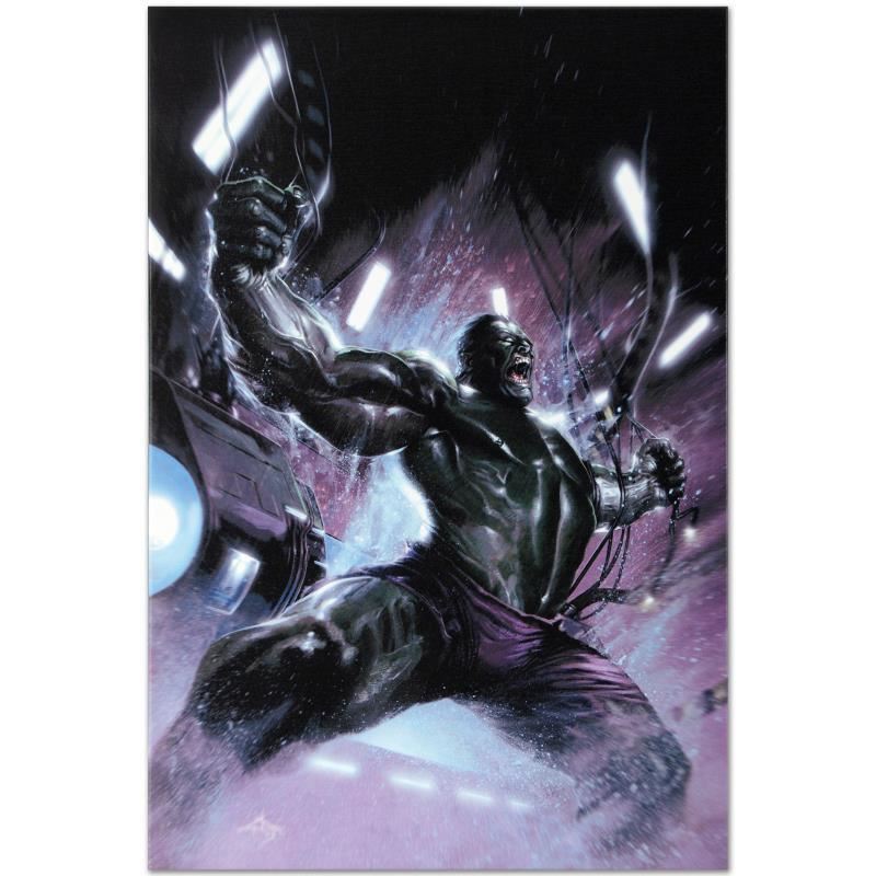 A piece of comic book history, this limited edition, from original art by Gabriele Dell'Otto, depicts an enraged Hulk. In 1998 Dell'Otto started collaborating with the European division of Marvel Comics, producing covers, posters and lithographies for Italy, France and Germany. In 2002, his work was shown to the editor-in-chief of Marvel Comics, who entrusted to him with the art for the Secret War mini-series. "Secret War #1" is a limited edition giclee on canvas by Gabriele Dell'Otto presented by Marvel Comics! This piece comes gallery wrapped. Includes Certificate of Authenticity! Measures approx. 18" x 27" (image). This item requires special handling and may have a longer than usual turnaround.