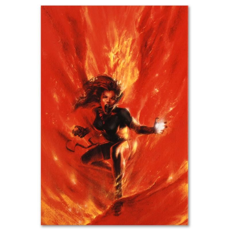 A piece of comic book history, this limited edition, from original art by Gabriele Dell'Otto, depicts Phoenix in a fiery blaze. In 1998 Dell'Otto started collaborating with the European division of Marvel Comics, producing covers, posters and lithographies for Italy, France and Germany. In 2002, his work was shown to the editor-in-chief of Marvel Comics, who entrusted him with the art for the Secret War mini-series. "Secret War #1" is a limited edition giclee on canvas by Gabriel Dell'Otto presented by Marvel Comics! This piece comes gallery wrapped. Includes Certificate of Authenticity! Measures approx. 18" x 27" (image).