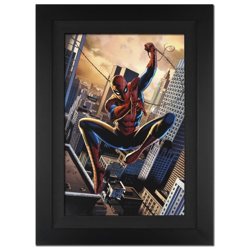 A piece of comic book history, this limited edition, from original art by Gabriele Dell'Otto, depicts an intense Spider-Man. In 1998 Dell'Otto started collaborating with the European division of Marvel Comics, producing covers, posters and lithographies for Italy, France and Germany. In 2002, his work was shown to the editor-in-chief of Marvel Comics, who entrusted to him with the art for the Secret War mini-series. "Secret War #4" is an extremely limited edition giclee on canvas by Gabriele Dell'Otto presented by Marvel Comics, hand signed by the great Stan Lee and numbered out of only 4! This piece is custom framed and ready to hang. Includes Certificate of Authenticity! Measure approx. 29" x 40" (with frame), 22" x 33" (image).
