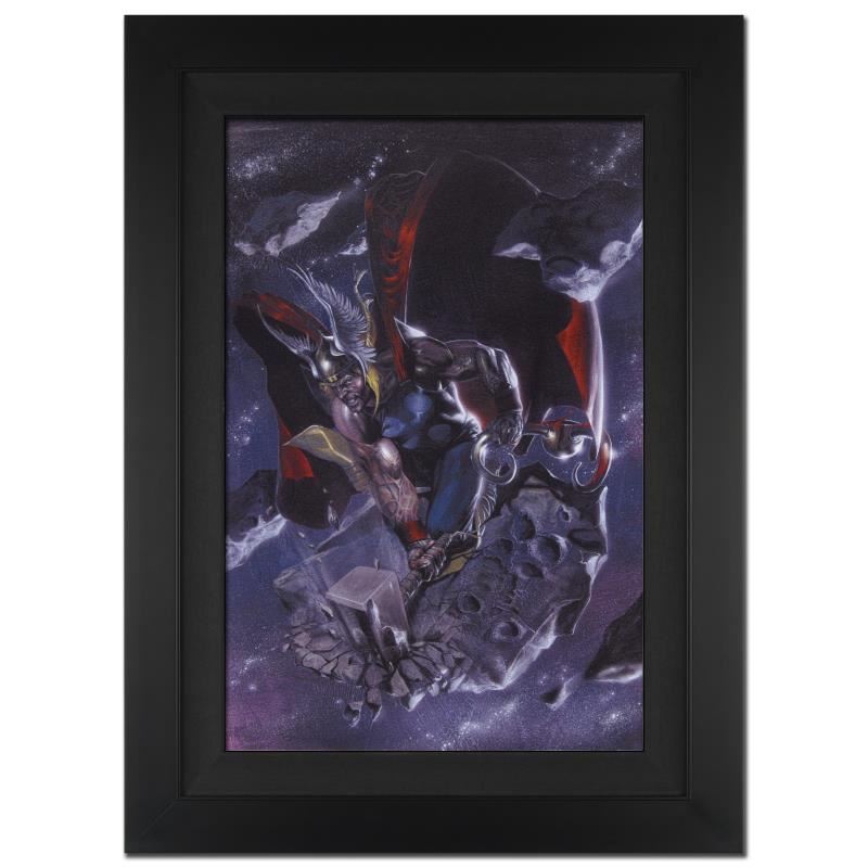 A piece of comic book history, this limited edition, from original art by Gabriele Dell'Otto, depicts an enraged Thor. In 1998 Dell'Otto started collaborating with the European division of Marvel Comics, producing covers, posters and lithographies for Italy, France and Germany. In 2002, his work was shown to the editor-in-chief of Marvel Comics, who entrusted to him with the art for the Secret War mini-series. "Secret War #4" is an extremely limited edition numbered giclee on canvas by Gabriele Dell'Otto presented by Marvel Comics, hand signed by the great Stan Lee and numbered out of only 10! This piece comes custom framed and ready to hang. Includes Certificate of Authenticity! Measures approx. 25" x 34" (with frame), 18" x 27" (image). Please allow 5 additional business for items that include canvas stretch or framing.