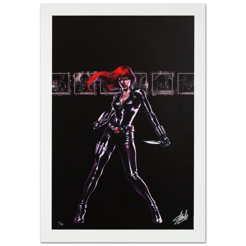 A piece of comic book history, this limited edition, from original art by Gabriele Dell'Otto, depicts an intense Black Widow. In 1998 Dell'Otto started collaborating with the European division of Marvel Comics, producing covers, posters and lithographies for Italy, France and Germany. In 2002, his work was shown to the editor-in-chief of Marvel Comics, who entrusted to him with the art for the Secret War mini-series. "Secret War #4" is a limited edition giclee on canvas by Gabriele Dell'Otto presented by Marvel Comics, numbered and hand signed by the great Stan Lee! Includes Certificate of Authenticity! Measures approx. 18" x 27" (image).