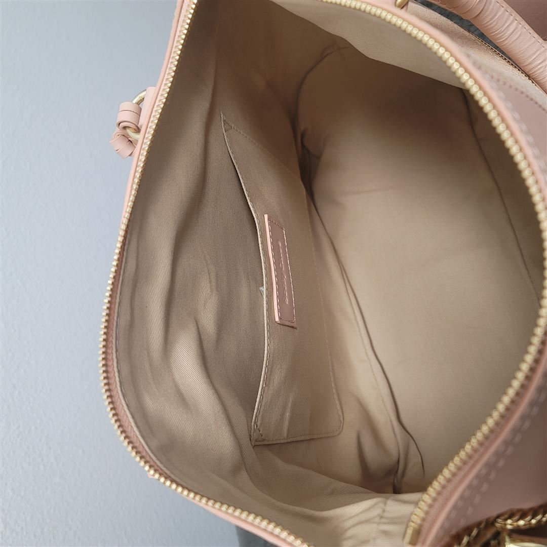One See by Chloe Medium Patch Bag in "Powder" w/ Gold Hardware. Crafted in a patchwork design of pink leather and suede, this See by Chloe Emy bag is a roomy satchel that's designed to be able to take on all your day-to-day needs--and gets a hint of signature style from the high-shine hardware that adorns the front.