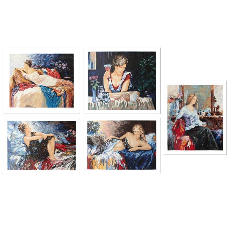 "Long Day, Thinking of You, Relaxation, Sleeping Beauty, Mary" is a 5 piece set of limited edition Serigraph on Paper by Sergey Ignatenko. The pieces are individually numbered and hand signed by the artist and come with a letter of authenticity. Measures approximately 19.5" x 16.5" (each).