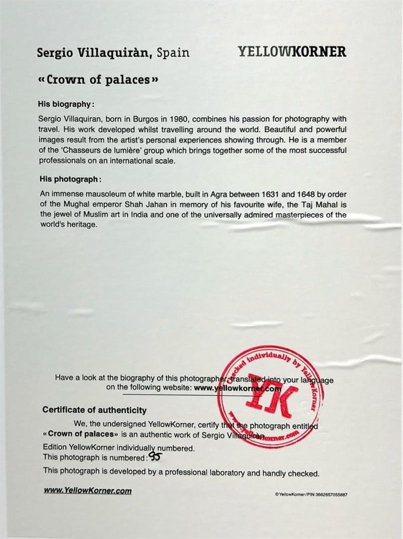 Sergio Villaquiran Tahj Mahal India Crown Of Palaces YellowKorner Certified Photograph. Certificate of Authenticity from YellowKorner affixed to the back. Matted Dimensions 16"x20". Protected with Clear Mylar Sleeve.