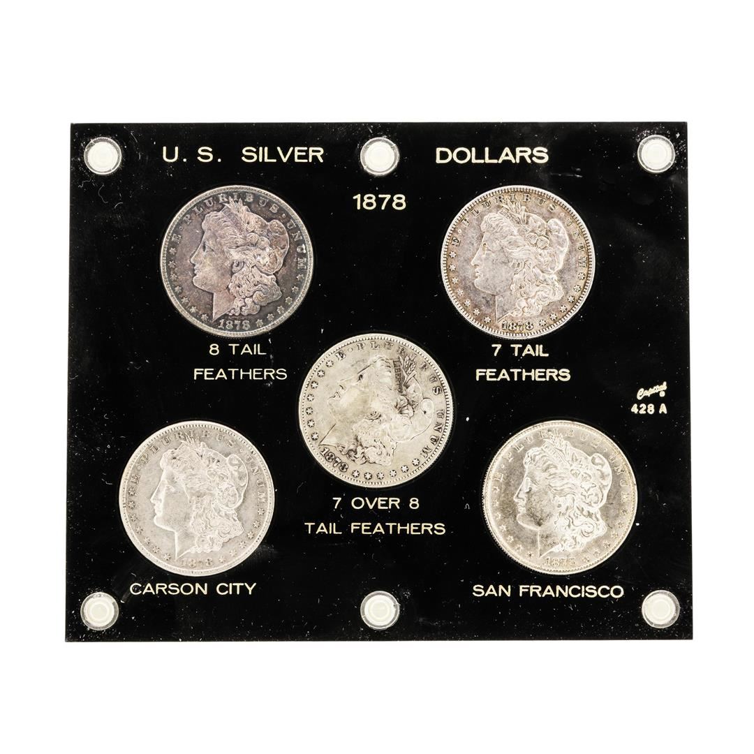 Set of (5) 1878 $1 Morgan Silver Dollar Coins including the following coins: 1878 8TF $1 Morgan Silver Dollar, 1878 7 TF $1 Morgan Silver Dollar Coin, 1878 7 over 8 TF $1 Morgan Silver Dollar Coin, 1878-CC $1 Morgan Silver Dollar Coin, and a 1878-S $1 Mor