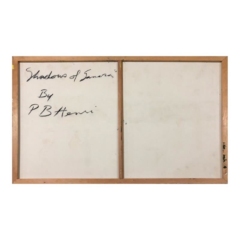 "Shadows of Sonora" is an original oil painting on stretched canvas by Paul Blaine Henrie (1932-1999). The piece is hand signed by the artist and comes with a letter of authenticity. Please note that due to the age of this piece and the way it was stored, there are minor sings of wear, particularly on the corners and edges. Measures approximately. 40" x 60" (image).