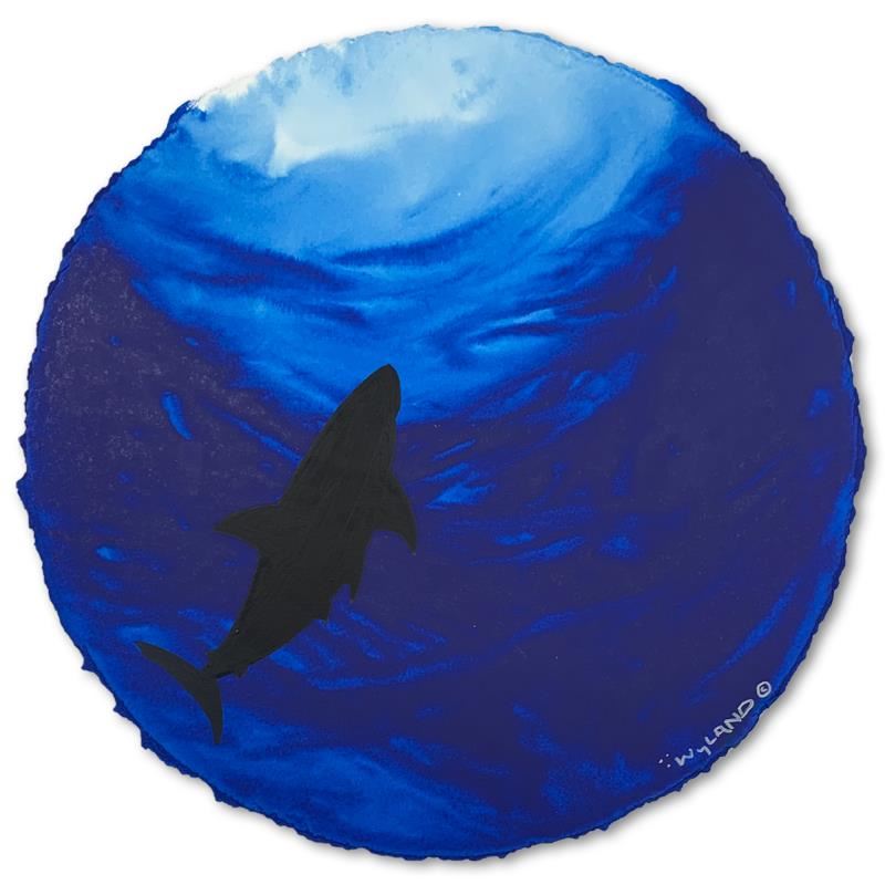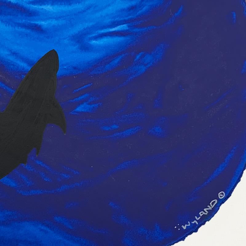 "Shark Swimming Deep" is an original painting, watercolor on deckle edge paper by Wyland. Hand signed by the artist, the piece comes custom framed and with a letter of authenticity. Measures approximately 30" x 30" (framed), 19.5" x 19.5" (image).