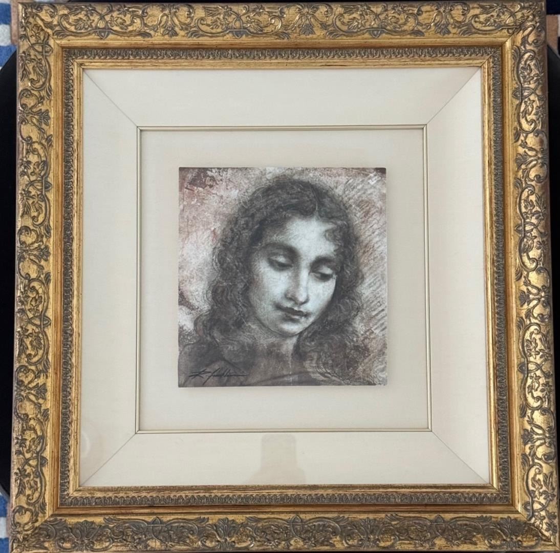 Exquisitely framed, this 1995 Richard Franklin original drawing on canvas measures 24x22.75"and 9x9.5" image size.
