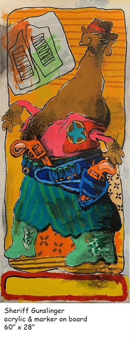 There's a new Sheriff in town, in Stephen Holland's whimsical world of Longneck characters. A 60x28" acrylic & marker pen on board w/COA
