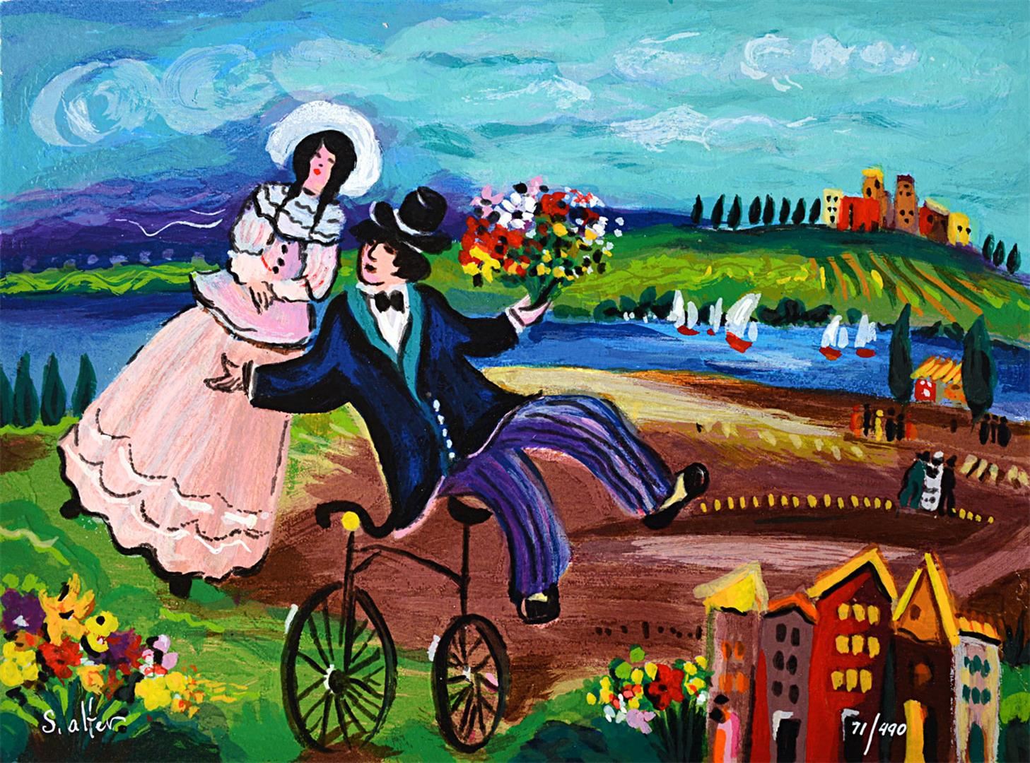 Artist: Shlomo Alter - Title: Frolic at the Lake - Medium: Serigraph on Fine Art Paper - Signature: Hand-signed by the Artist - Limited Edition: 490 - Paper Size: Approximately 10 inches x 13.25 inches - Unframed - Details: This work comes with a Certificate of Authenticity - Biography: Shlomo Alter was born in Romania to a family of restaurateurs. He emigrated to Israel in 1948 and during high school he started to study painting under the well known artist Aaron Avni. Some of his early works appeared in UNICEF'S world touring exhibition of young artists. Altar's works are influenced by his early recollections of the well dressed people who gathered in the courtyard of his parent's restaurant in Bucharest to eat and drink, to dance of Gypsy bands, and to enjoy the convivial atmosphere. With a touch of optimism and good humor Alter's art reflects life at its core, an antithesis to the Nazi regime that shattered his childhood happiness. His paintings are like stage set on which the objects relate to each other through a glow of colors and lines - a frozen moment in time, a dynamic stillness prior to a burst of action. His style can best be compared to that of the Expressionists. He uses color to give direct expression to his ideas in influence by the famous, particularly Matisse and Duty.