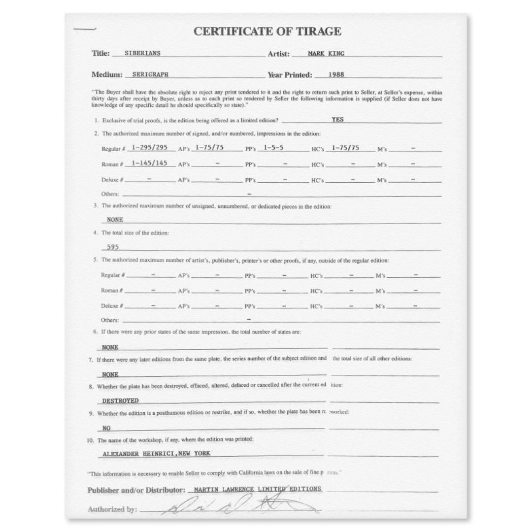 "Siberians" is a limited edition serigraph on paper by Mark King (1931-2014). Hand signed and numbered this piece comes with a letter of authenticity and measures approximately 26" x 35" (image).
