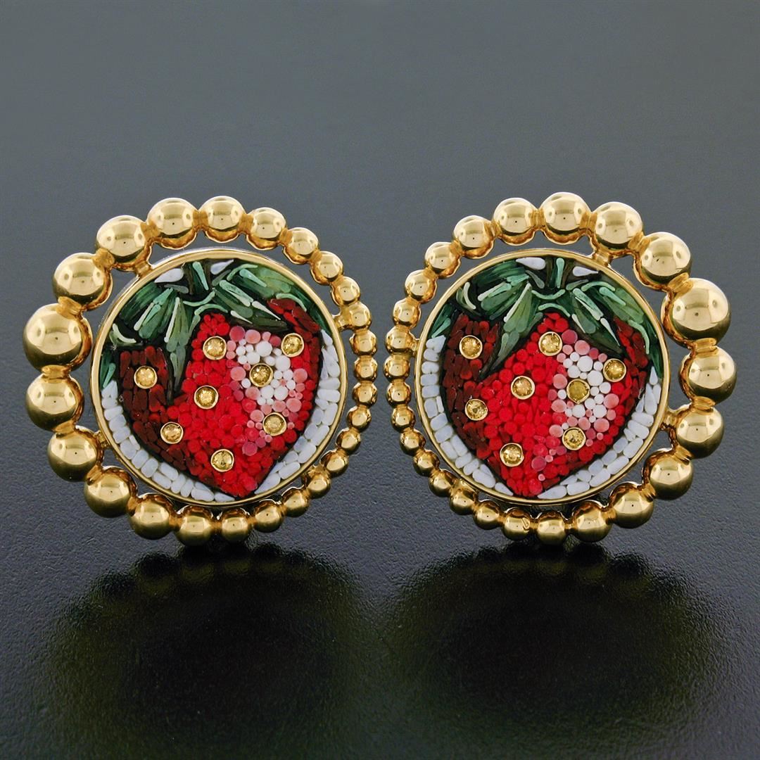 An estate solid 18k yellow gold micromosaic strawberry button earrings by Sicis, with 16 round brilliant natural yellow sapphires (0.48ctw). The earrings measure approximately 25.5mm in diameter and weigh a total of 24.26 grams.