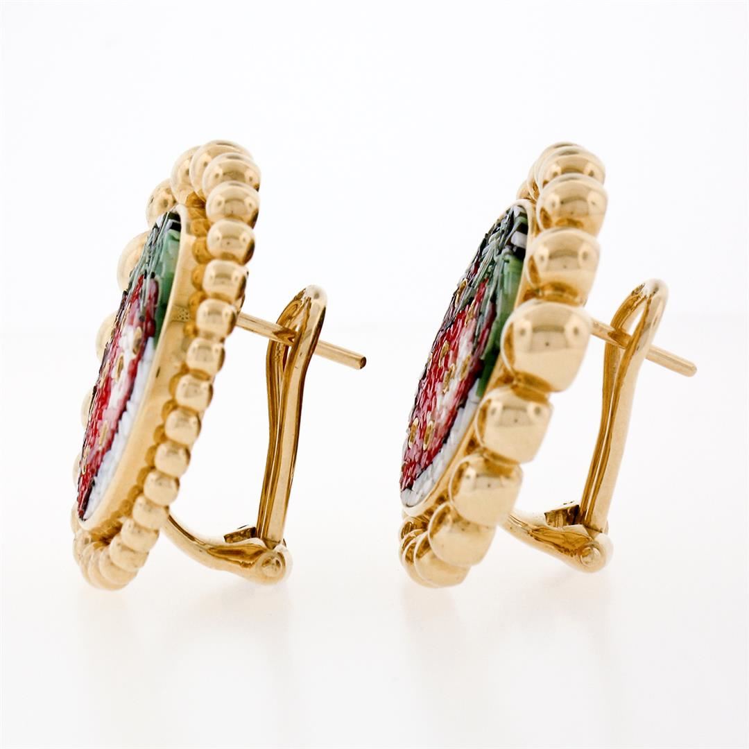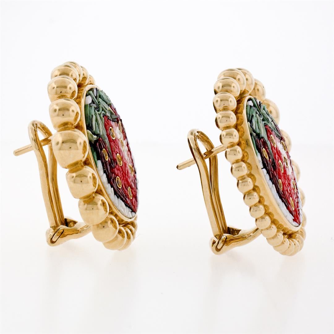 An estate solid 18k yellow gold micromosaic strawberry button earrings by Sicis, with 16 round brilliant natural yellow sapphires (0.48ctw). The earrings measure approximately 25.5mm in diameter and weigh a total of 24.26 grams.