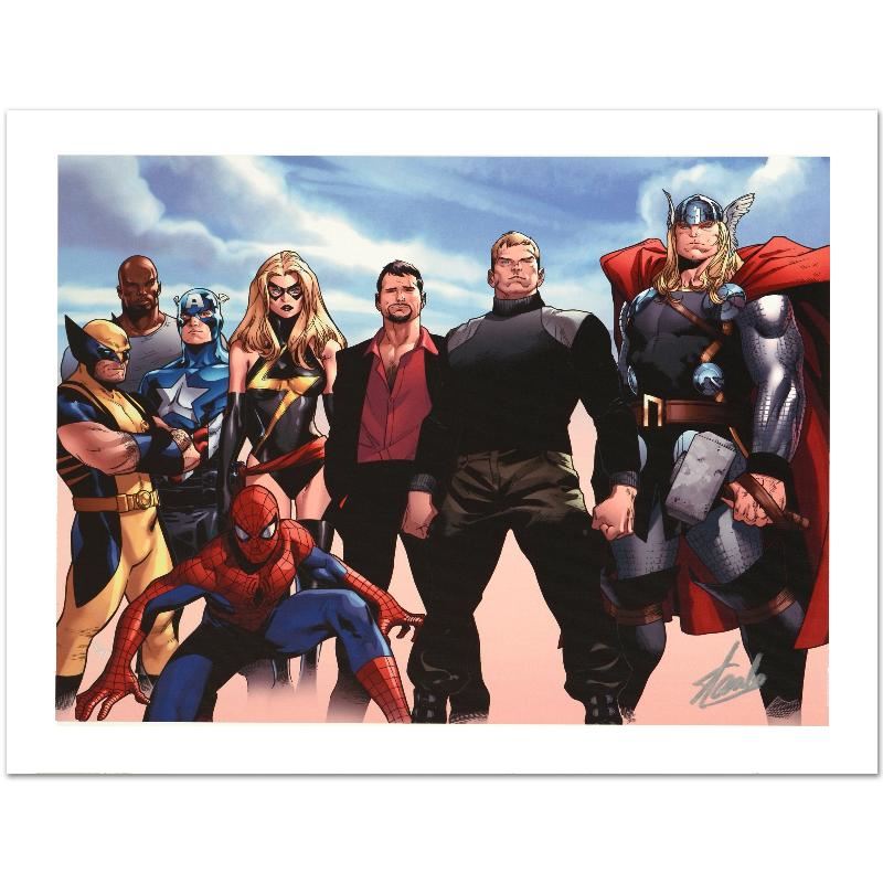 A piece of comic book history, this limited edition, from original art by Oliver Coipel, depicts heroic characters from the Marvel Universe. Olivier Coipel is a French comic book artist, known for his work on books such as House of M, Legion of Super-Heroes and Thor. Coipel signed an exclusive contract with Marvel Comics in January 2005. He was named in August 2005 as one of Marvel's "Young Guns," a group of artists that that included Jim Cheung, David Finch, Trevor Hairsine, Adi Granov, and Steve McNiven, which according to Marvel Editor-in-Chief Joe Quesada, exhibited the qualities that make "a future superstar penciller." Siege #4" is limited edition giclee on canvas by Oliver Coipel presented by Marvel Comics, numbered and hand signed by the great Stan Lee! Includes Certificate of Authenticity! Measures approx. 24" x 18" (image).