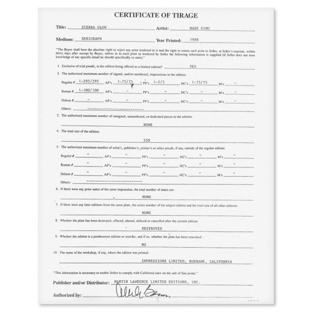 "Sierra Glow" is a limited edition serigraph on paper by Mark King (1931-2014). Hand signed and numbered, this piece comes with a letter of authenticity and measures approximately 28" x 37" (image).